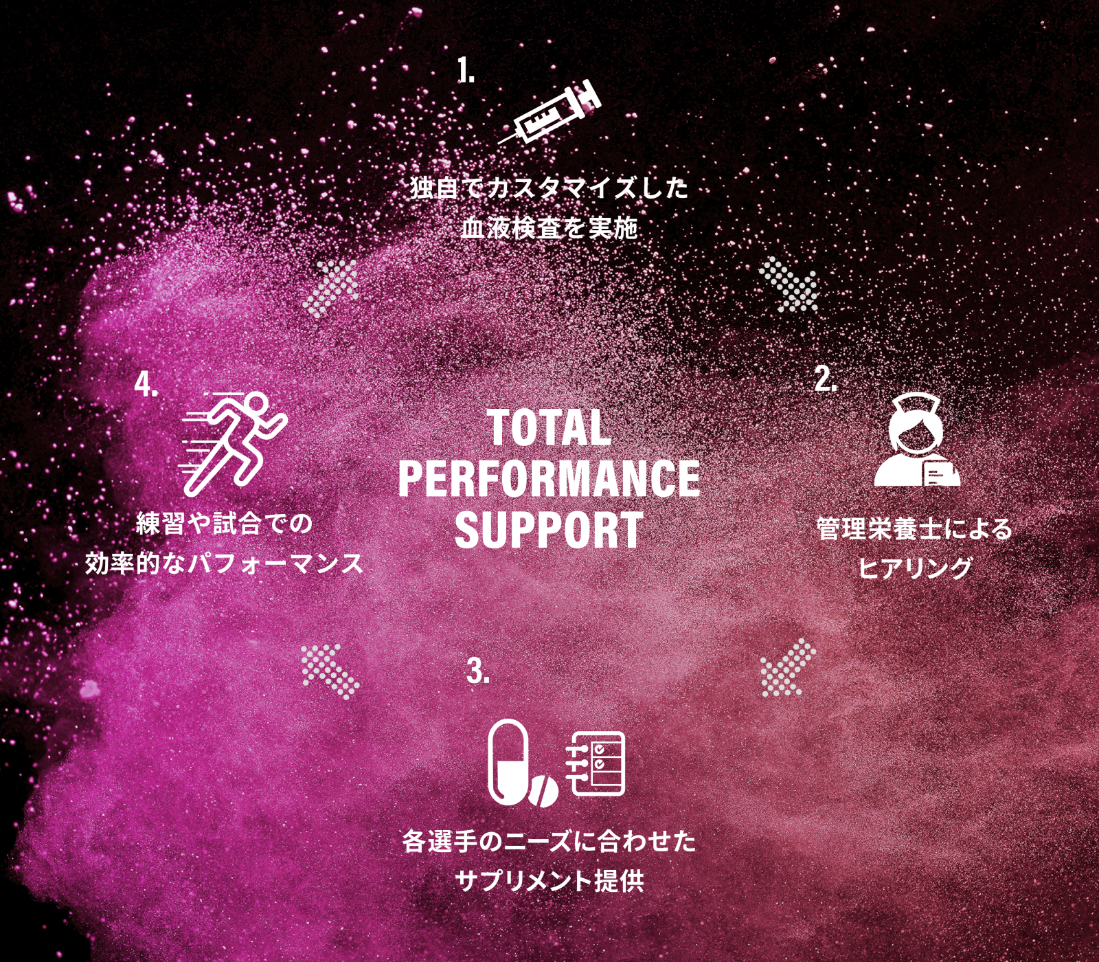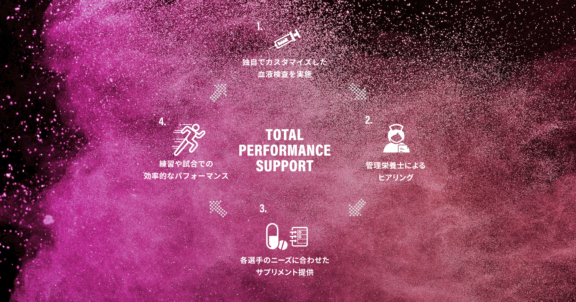 血液検査とスポーツ栄養士のヒアリングから、パフォーマンスアップまで導く、パーソナライズ栄養サポートプログラムです。血液検査を実施することにより、選手が個別に持つ身体課題を把握することができ、原因や対応策を明確にします。パフォーマンス向上・疲労改善・フィジカル強化などの課題に対して最適な栄養指導を行い、選手の競技人生を支えます。
